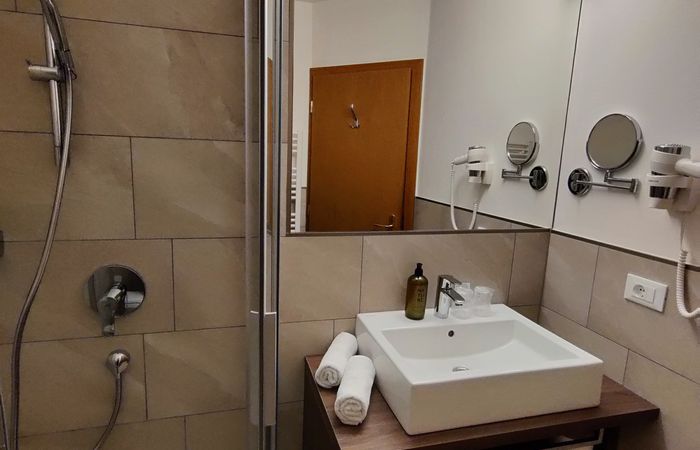 La camera singola dispone di un balcone (ca. 4 m²), un piccolo tavolo con sedie, TV satellitare, telefono e cassaforte e un bagno con doccia, WC e asciugacapelli.